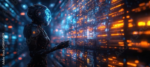 Futuristic Robot Interacting with Digital Holographic Interface in High-Tech Server Room