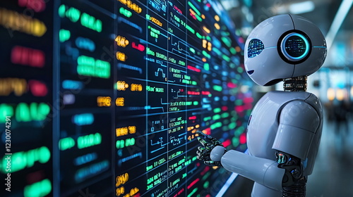 Futuristic robot interacting with glowing digital interface filled with data and graphs in a modern tech environment illuminated by neon colors.