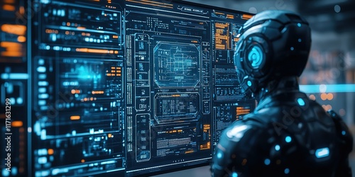 Futuristic robot interacts with advanced technology in a high-tech laboratory setting, exploring data on glowing screens