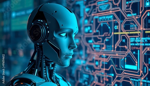 Futuristic Robot Looking at Circuitry.