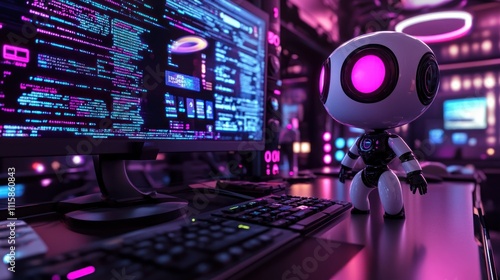 Futuristic robot sits at a computer desk with coding displayed on the screen.
