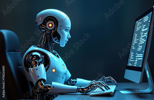 Futuristic robot sits at desk using computer. AI robot works on pc. Sci-fi illustration tech concept. Artificial intelligence, machine learning. Robot uses keyboard to type. Robot working in modern