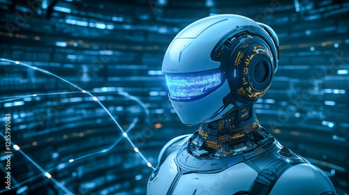 Futuristic robot stands in a high-tech environment with glowing blue eyes surrounded by a network of lights