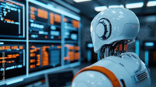 futuristic robot stands in front of multiple screens displaying data and code, showcasing advanced technology and artificial intelligence. scene evokes sense of innovation and progress.