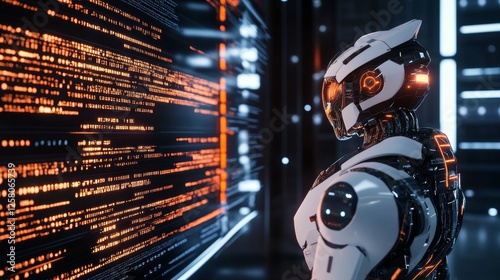 Futuristic robot with glowing design and programming code overlay on a dark background, symbolizing artificial intelligence, technology, and the evolution of robotics in 3D rendering