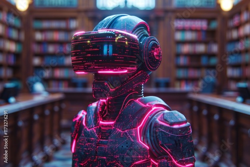 Futuristic robot with glowing pink lights in a library setting. AI generative. .