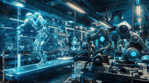 futuristic robotics lab where engineers are working on advanced robotic systems using holographic simulations