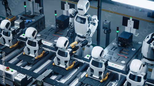 Futuristic Robots Efficiently Construct Advanced Androids on a Assembly Line, Showcasing Innovative Engineering and Precision Automation in a Advanced Industrial Environment.