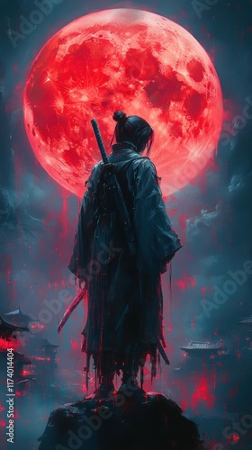 Futuristic Samurai Cyberpunk Warrior with Katana Under Full Moon