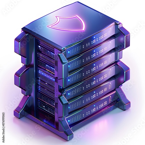 Futuristic server stack with glowing lights representing data security and advanced technology in a modern data center.