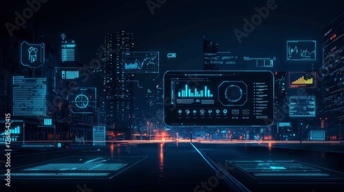 Futuristic Smart City Data Visualization and Urban Technology at Night