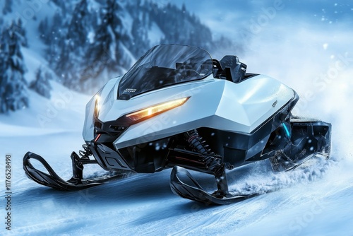 Futuristic snowmobile speeds through snowy landscape.