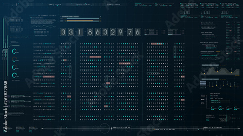 Futuristic source code digital data telemetry motion graphic display screen with user interface display for digital background computer desktop display screen