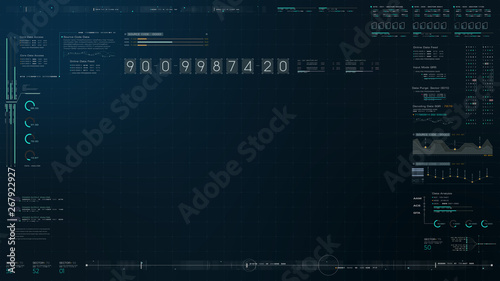 Futuristic source code digital data telemetry motion graphic display screen with user interface display for digital background computer desktop display screen