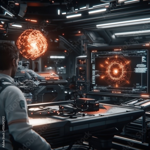 Futuristic Space Command Center with High-Tech Display and Star Model
