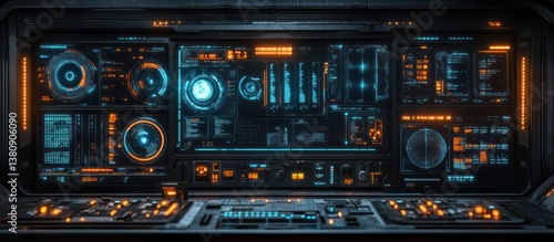 Futuristic spaceship control panel, data streams, dark background, UI design