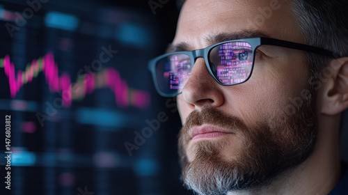 Futuristic stock trader analyzing data with glasses reflecting charts and graphs