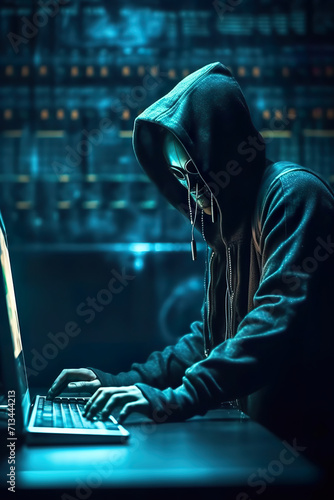 Futuristic style Hooded Hacker with mask using Laptop Break or Attack into Data server