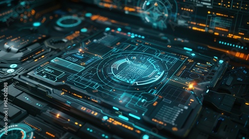 Futuristic Tech Interface with Glowing Blue and Orange Displays