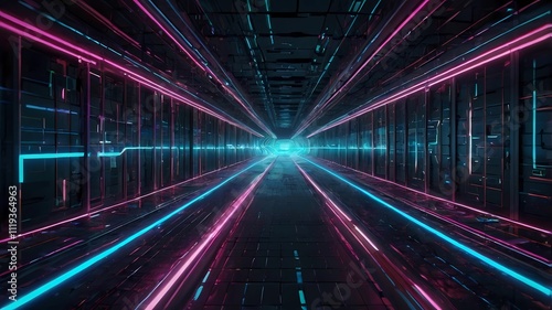 Futuristic technology abstract background with lines for network, big data, data center, server, internet, speed. Abstract neon lights into digital technology tunnel