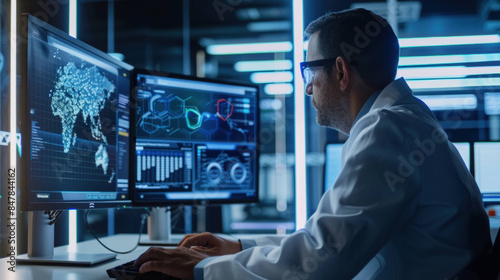 Futuristic Technology Concept - Scientist Analyzing Data with AI Algorithms on Computer Screen