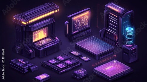 Futuristic technology devices, server, computer, and data storage.