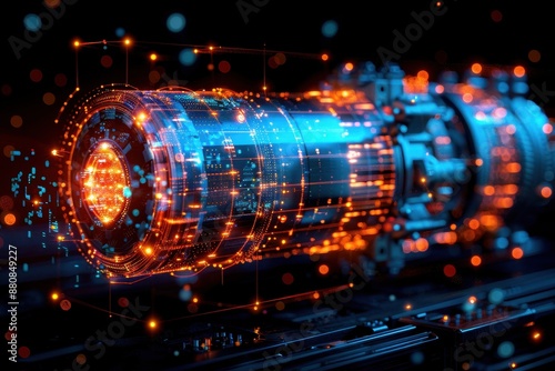 Futuristic technology engine with glowing circuits and holographic elements, perfect for innovation and high-tech concept visuals.