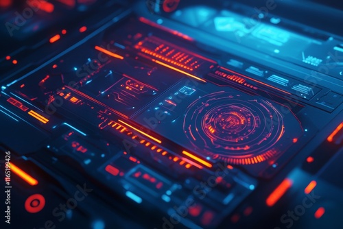 Futuristic Technology Interface: Red and Blue Neon Lights on a Digital Panel