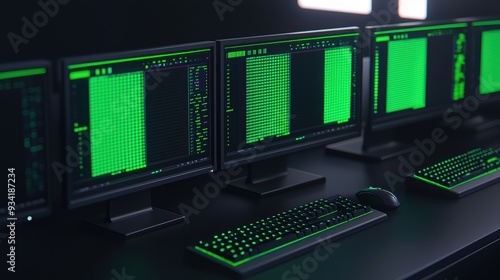 Futuristic workspace with multiple monitors displaying green data. Ideal for tech, coding, and cybersecurity themes.