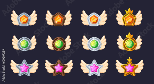 Game ranking levels. Rating award badges with crystal gem wings and royal crown, star round shield frame platinum medal of level up achievement insignia cartoon vector illustration