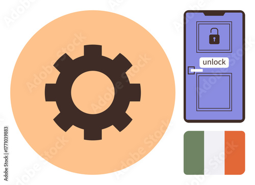 Gear for functionality, door with lock for security context, unlock label for solution idea, Irish flag for location. Ideal for usability, innovation, systems thinking, problem-solving, progress
