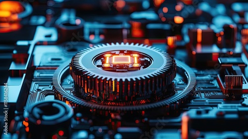 Gear Mechanism concept. Close-up of a futuristic microchip with glowing components and intricate details.