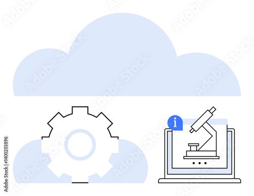 Gear overlapped with a cloud and a microscope on a laptop screen emphasize online research, innovation, and digital tech. Ideal for science, data, cloud computing, research, education, productivity