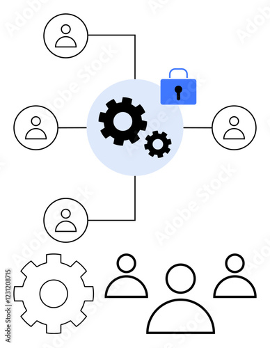 Gears in a network linked to user icons and a lock for security. Ideal for cybersecurity, data protection, team collaboration, machine processes, IT systems, secure operations, abstract line flat