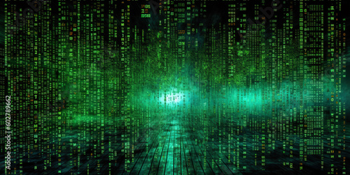 Generative AI. Binary code with neon rays on a black background. Computer language, binary code, background, illustration, technology. Illustration with binary programming codes. technology.