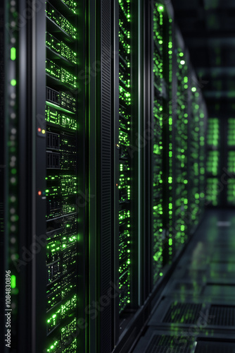 Generative AI hardware stack, towers of computers and processing technology - hardware, green data and programming concept. Artificial intelligence.