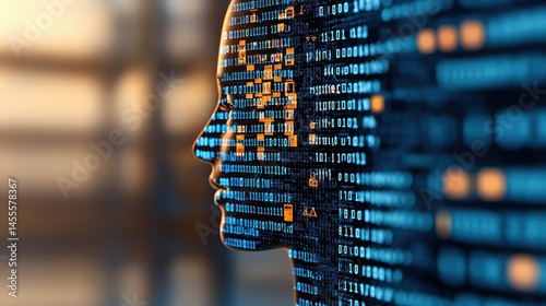 Generative AI Neural Networks Concept. An inspiring digital representation of a human profile composed of binary code and abstract data patterns, showcasing technology and innovation.