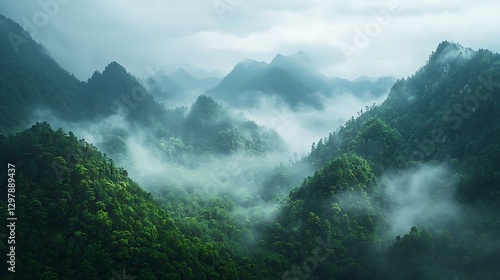 Gentle Breeze Through Misty Forest Slopes high resolution image