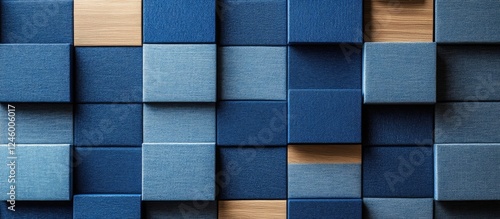Geometric acoustic panels in various blue shades arranged on a wooden textured background for modern interior design aesthetics