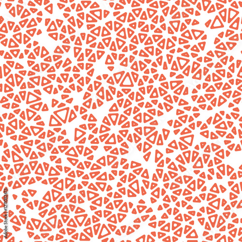 Geometric background with tiny triangles in a solid coral sunset glow. Seamless vector illustration with rounded triangular cells outlined in a repeatable pattern.