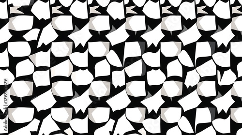 Geometric Illusion: An abstract pattern of interlocking shapes in a monochrome scheme. The design creates a dynamic visual rhythm and interplay of light and shadow.