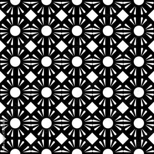 Geometric radiant floral symmetry pattern, seamless black and white background, vector illustration.