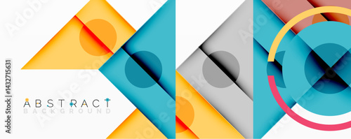 Geometric shapes overlap creating vibrant modern design. Yellow, blue, gray hues dominate composition. Minimalist aesthetic.