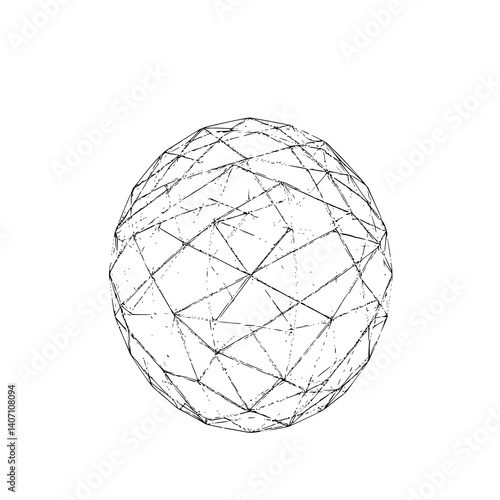 Wireframe 3D sphere with geometric polygonal facets and lines on white background, abstract concept