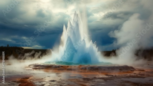 Geyser erupting in a dramatic landscape