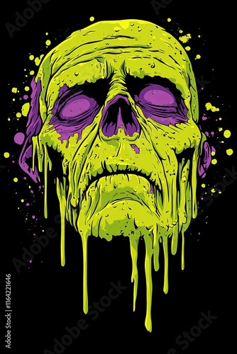 Ghoulish illustration of a melting zombie head against a black background with splattered paint.