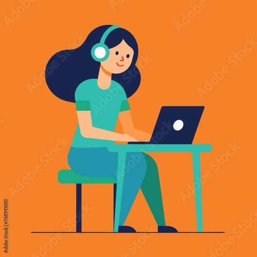 Girl is working at the desktop with a laptop flat design illustration