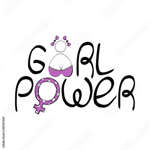 Girl power - woman motivational slogan. Feminism quote for motivation poster. Hand drawn lettering. Stylized letter - girl silhouette in pink bra