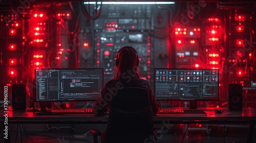 girl sitting at a computer in dark colors, hacker. Generative AI
