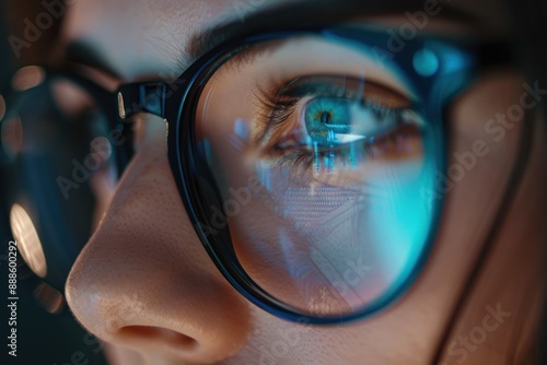 Girl works on internet. Reflection at the glasses from laptop. Close up of woman's eyes with black female glasses